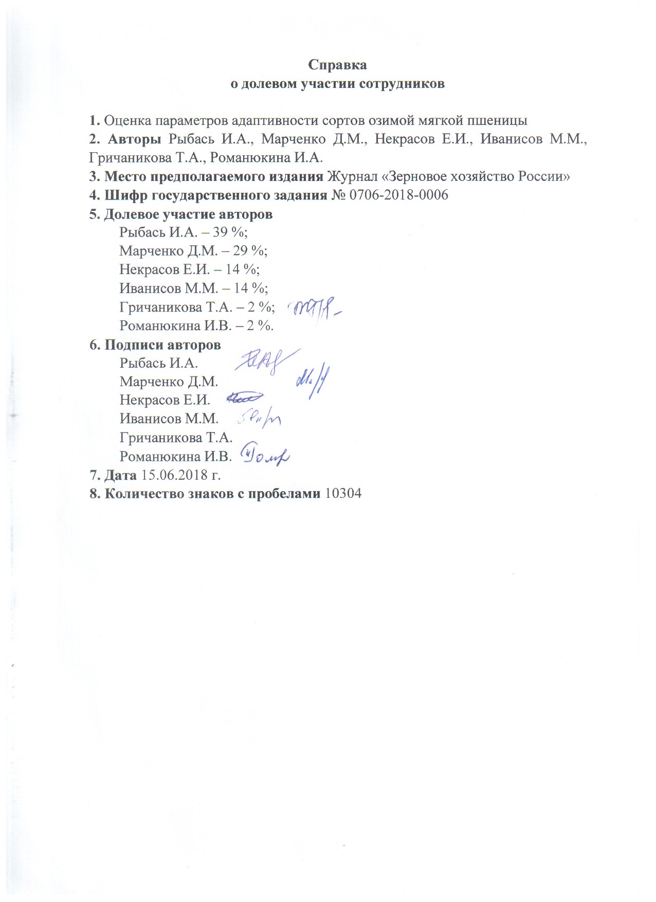 Рыбась И.А., Марченко Д.М., Некрасов Е.И., Иванисов М.М., Гричаникова Т.А., Романюкина И.В. Оценка параметров адаптивности сортов озимой мягкой пшеницы. Зерновое хозяйство России. 2018;(4).